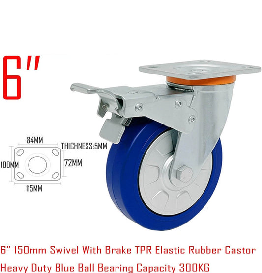 5"/6"/8" Heavy Duty Blue TPR Rubber Castor Wheel Plate Mount Swivel / Brake / Fixed